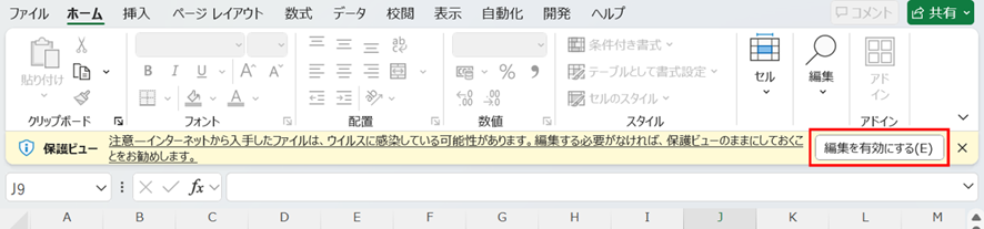 ファイルを開いた時に、画面上部に黄色い警告バーが表示されているか確認しましょう。