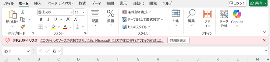 「コンテンツの有効化」が表示されず、「セキュリティリスク このファイルのソースが信頼できないため、Microsoftによりマクロの実行がブロックされました。」というメッセージと共に「詳細を表示」と表示された場合、ファイルを一度閉じます。