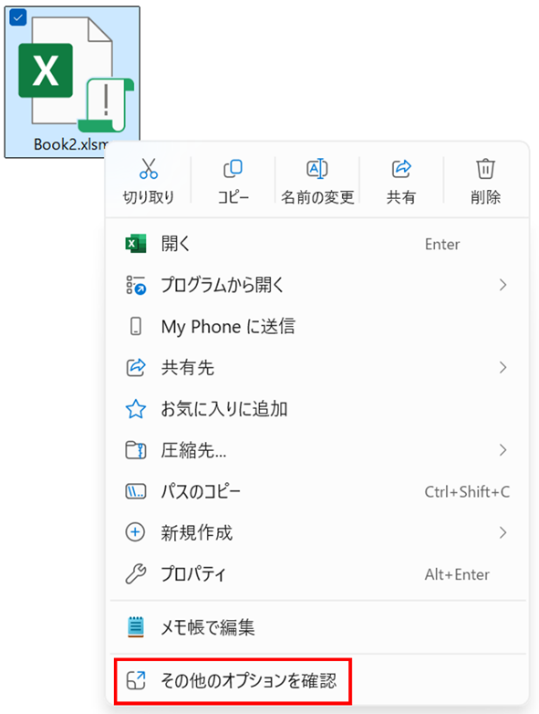 エクスプローラーでファイルのある場所を開き、右クリックして「その他のオプションを確認」をクリックします。