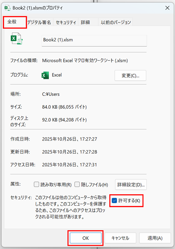 プロパティダイアログが表示されたら、「全般」タブの「許可する」にチェックをいれ、OKボタンをクリックします。ただし、この操作は信頼できるファイルに対してのみ行ってください。