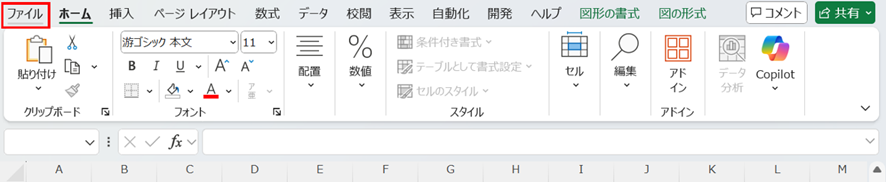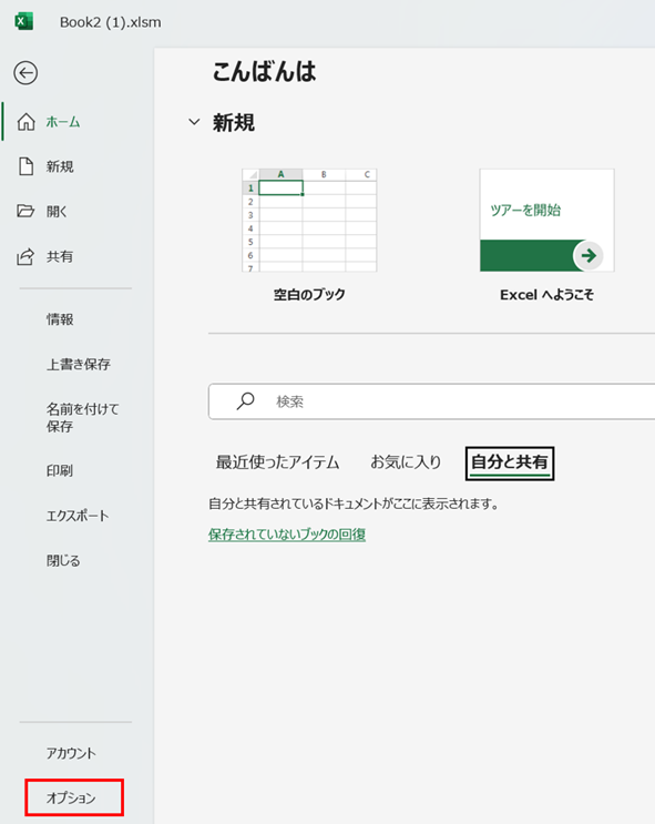「ファイル」タブをクリックして、左側のメニューから「オプション」を選択しましょう。