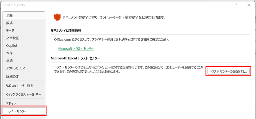「Excelのオプション」ダイアログで、左側のメニューから「トラストセンター」を選択し、「トラストセンターの設定」ボタンをクリックしてください。