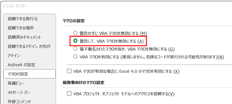 また、トラストセンターで「警告して、マクロを無効にする」を選択すれば適切な警告が表示され、設定が厳しすぎるとマクロが全く実行できないため確認が重要です。