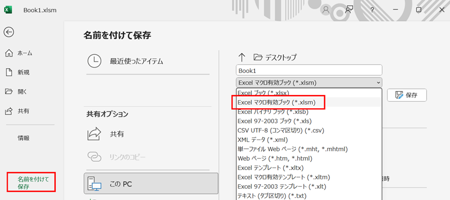 ・ファイル形式を.xlsmに変更してマクロを保存可能に