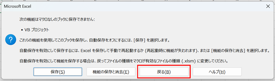 この警告が表示されたら、「戻る」をクリックして、ファイルの種類を.xlsmに変更してから保存し直しましょう。