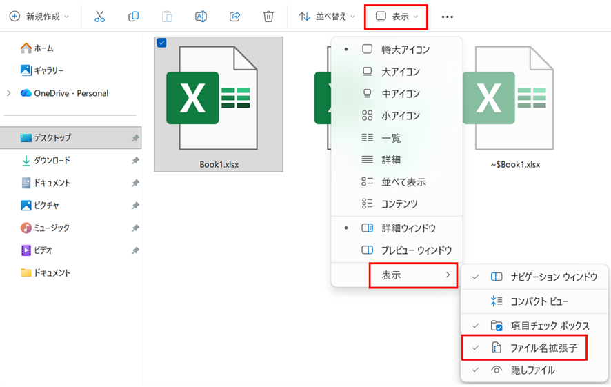 ファイル拡張子が表示されていない場合は、Windowsのエクスプローラーで「表示」タブ→「ファイル名拡張子」にチェックを入れると、拡張子が表示されるようになります。