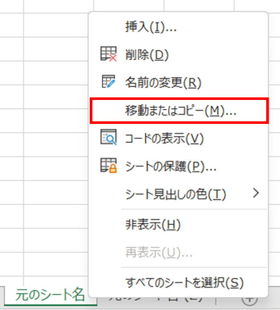 コピーしたい元のシートタブを右クリックして、「移動またはコピー」を選択します。