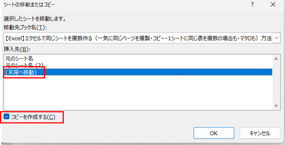 「移動またはコピー」ダイアログが表示されたら、以下の設定を行います。