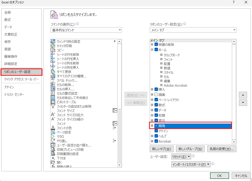 「開発」タブをクリックします(表示されていない場合は、ファイル→オプション→リボンのユーザー設定で「開発」にチェック)。
