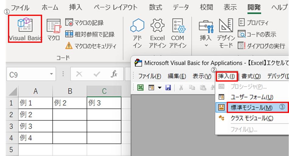 「挿入」→「標準モジュール」を選択して、新しいモジュールを作成しましょう。