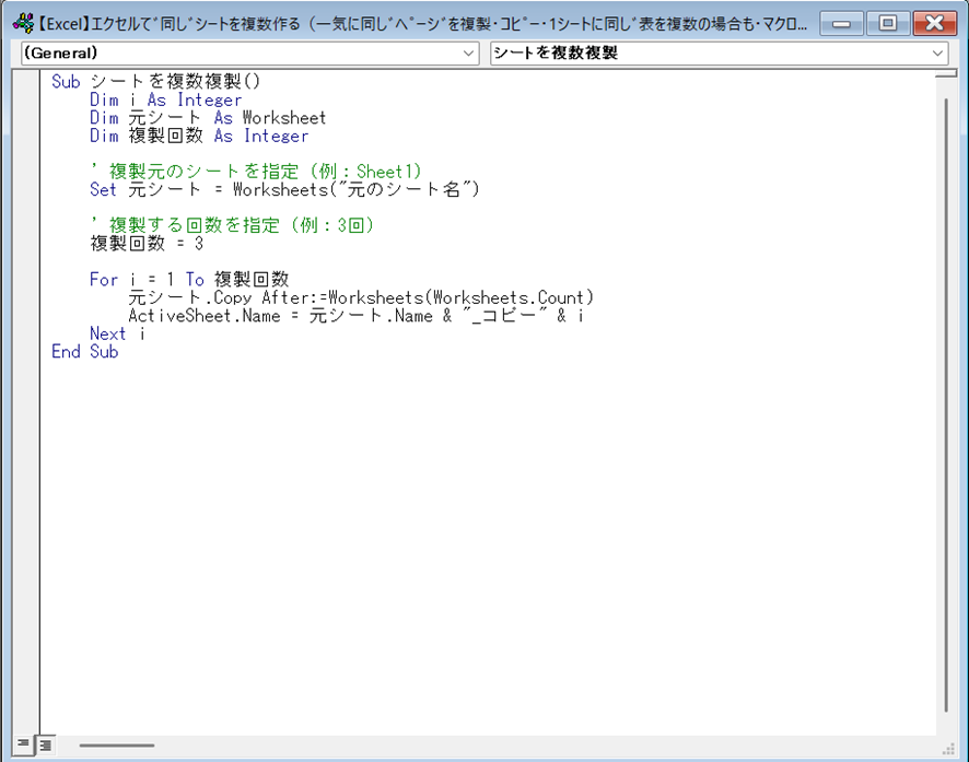 このコードは、現在アクティブなシートを元に、指定した回数だけシートをコピーし、連番の名前を付けます。