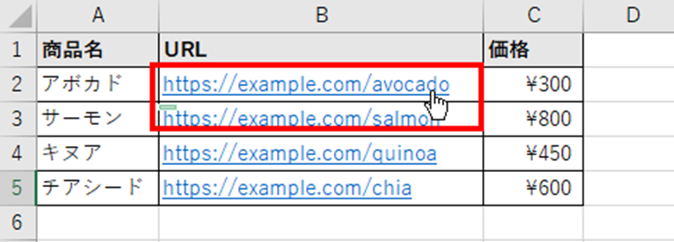 このデータでB列のURLをクリックすると、すぐにブラウザが開いてしまい、右クリックメニューが表示されません。