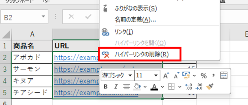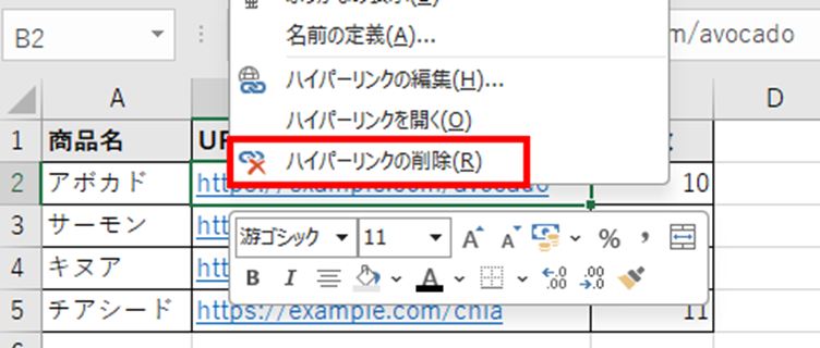 このデータのB列にある全てのハイパーリンクを一括で削除したい場合に有効です。
