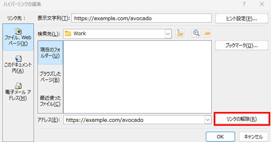 このダイアログの左下にある「リンクの解除」ボタンをクリックすれば、ハイパーリンクが削除されます。