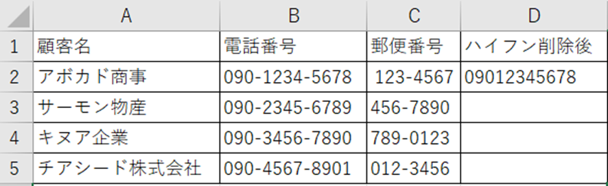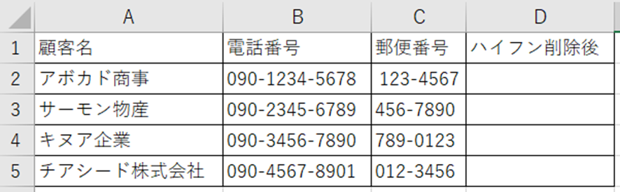 まず、ハイフンを削除した結果を表示する列を用意しましょう。例えばD列を使用します。