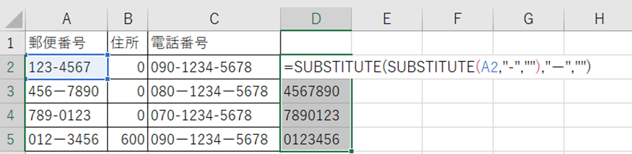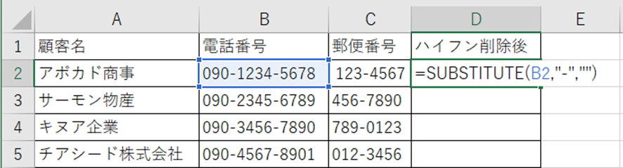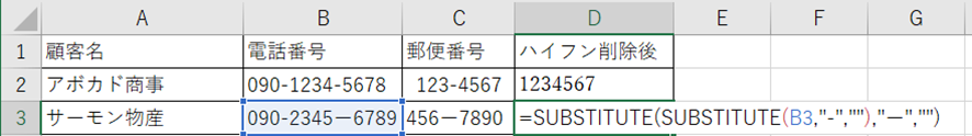 エクセルでSUBSTITUTE関数を使ってハイフンを削除する方法1【電話番号や郵便番号に最適】