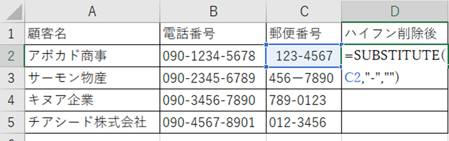 郵便番号のハイフンも同様に削除できます。C列の郵便番号からハイフンを削除したい場合は、以下の数式を使います。