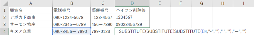 この数式は、まず半角ハイフンを削除してから、全角ハイフンも削除するため、どちらのハイフンが含まれていても完全に削除されます。