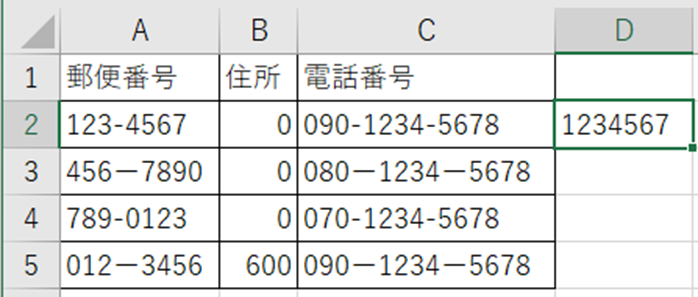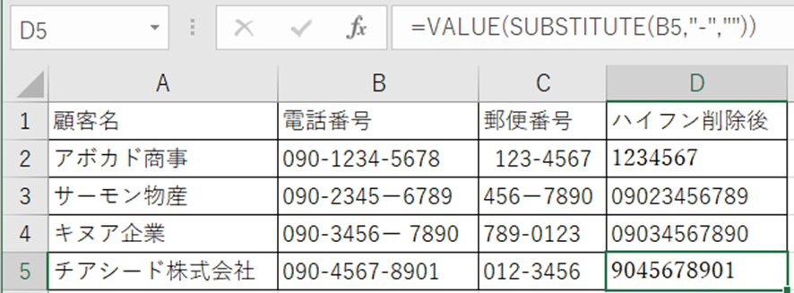 この数式は、ハイフンを削除してから数値に変換するため、計算に使える状態になります。ただし、電話番号の先頭の「0」が消えてしまうため、電話番号には使用しない方が良いかもしれません。