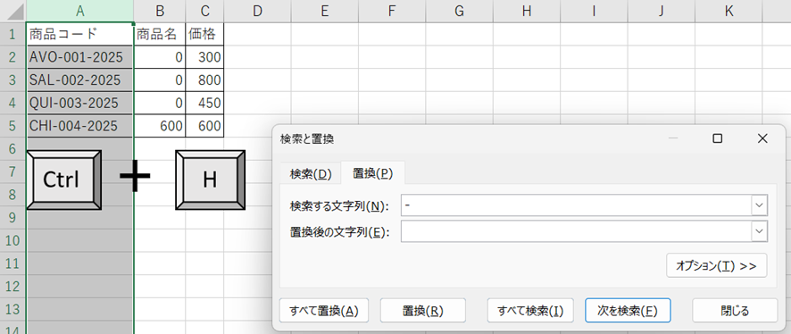 商品コードのハイフンを全て削除して、連続した文字列にしたい場合に有効です。