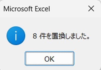 置換が完了すると、「○○個の項目を置換しました」というメッセージが表示されます。「OK」をクリックしてメッセージを閉じましょう。