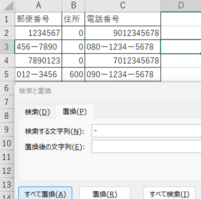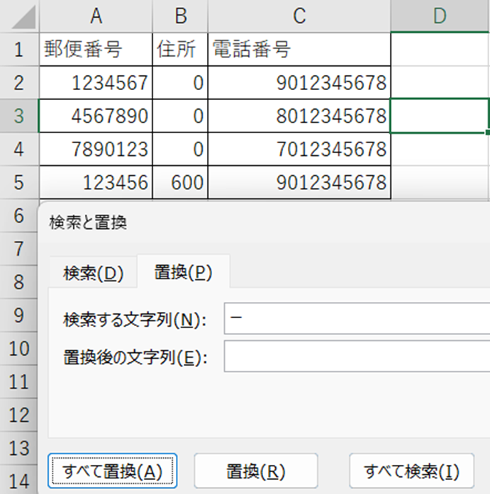エクセルで置換機能を使ってハイフンを一括削除する方法2【複数セルを同時処理】