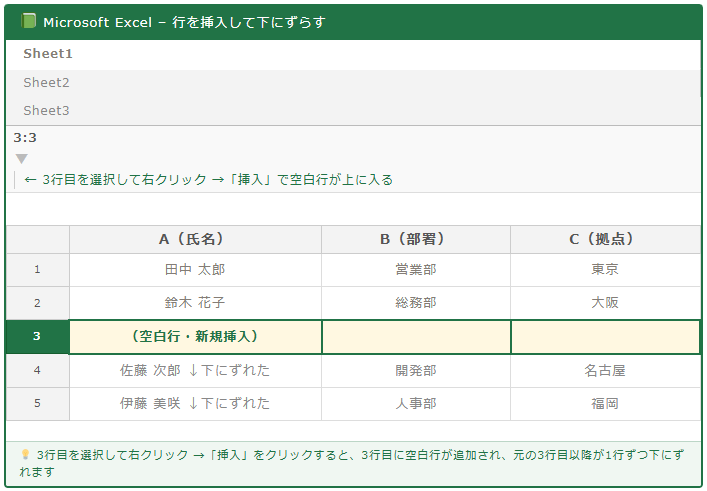 → 選択した行の上に空白行が挿入され、それ以降の行が下にずれます