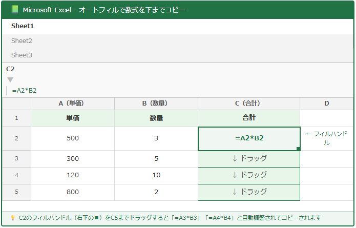 → C2の数式がC3〜C10にまとめてコピーされます
