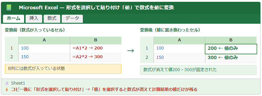 | 値と数値の書式 | ✗ | ✓ | ✓(数値書式のみ) | 書式を保ちながら値変換 |