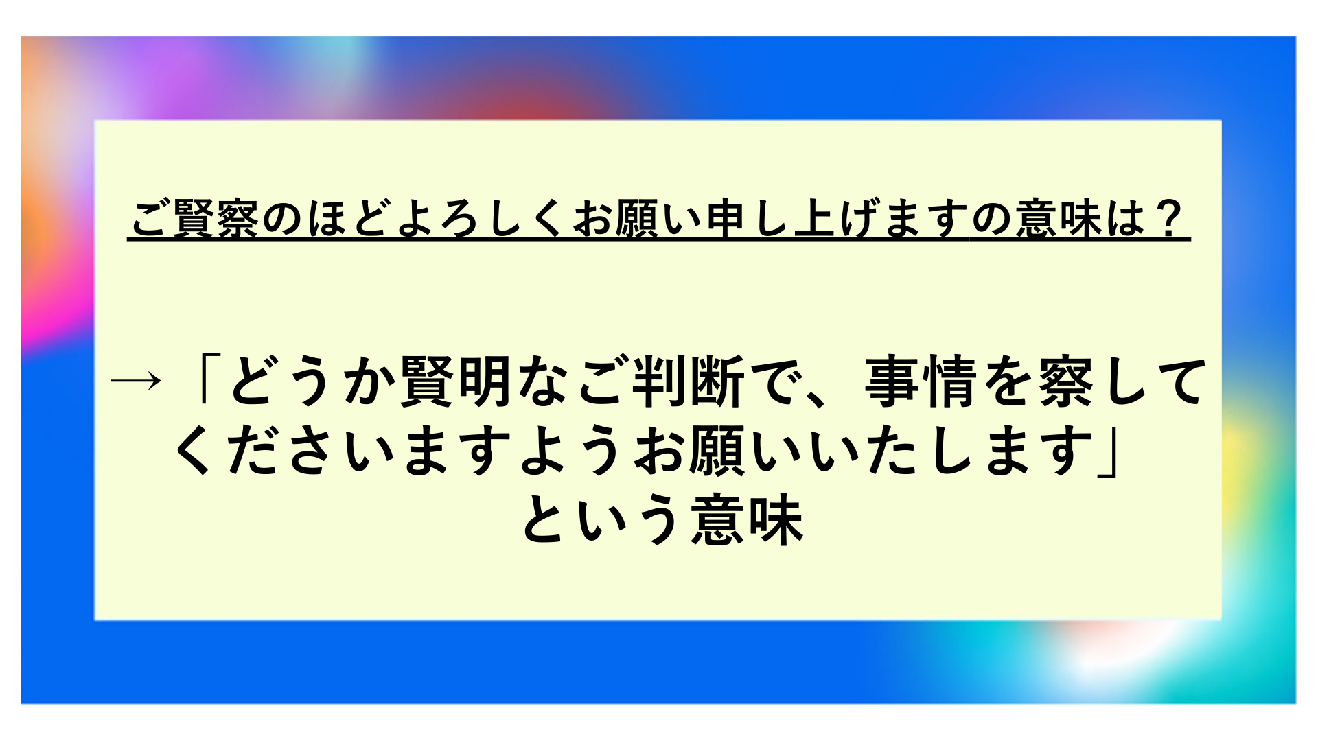 つまり「ご賢察のほどよろしくお願い申し上げます」は、「どうか賢明なご判断で、事情を察してくださいますようお願いいたします」という意味になるでしょう。
