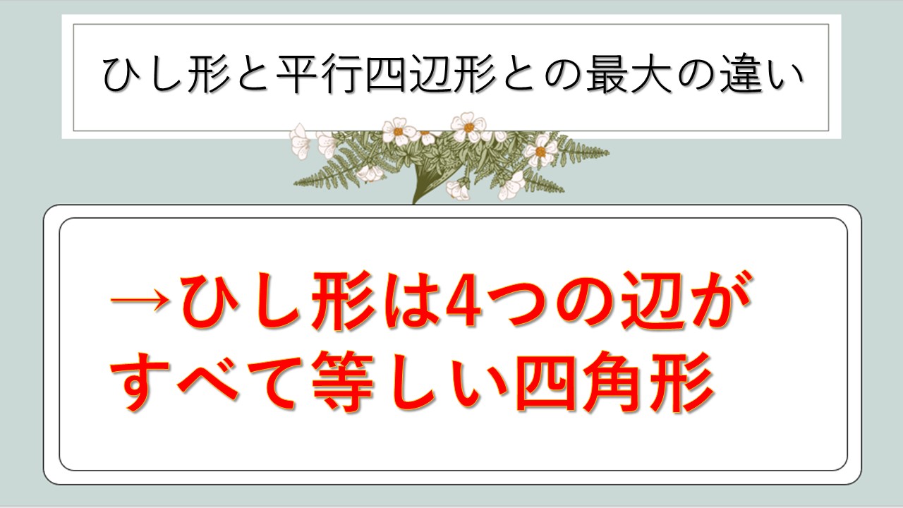 このように、ひし形は平行四辺形の性質に加えて、追加の条件を満たしているのです。