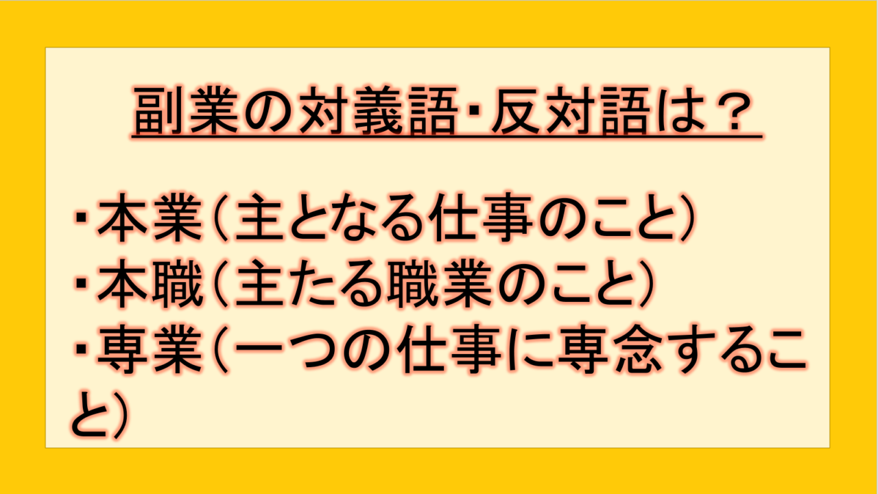 この記事では、「副業」の反対語・対義語について例文も交えて詳しく解説していきます。