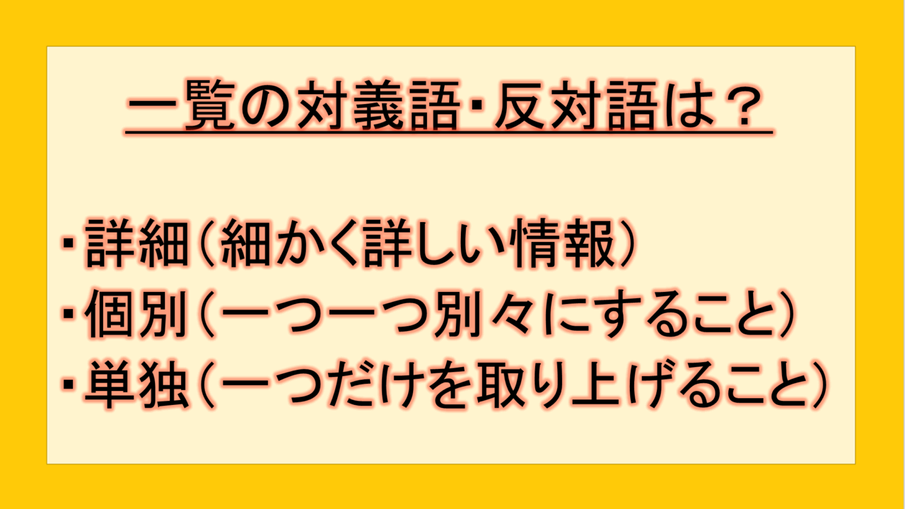 この記事では、「一覧」の反対語・対義語を、ビジネスシーンと日常会話の両方で使える例文とともに解説しました。