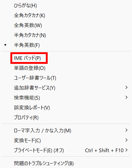 IMEパッドは、タスクバーの入力モードアイコンを右クリックして「IMEパッド」を開くことでアクセスできます。