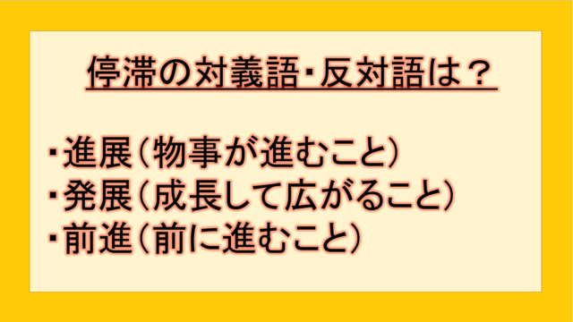 ビジネス 停滞の対義語・反対語(反対の言葉)・反意語・対照語は?例文も用いて徹底解説! yuki89829403 テクテク(TechTech)ライフ(旧:のほほんライフ) この記事では、「停滞」の反対語・対義語について例文も交えて詳しく解説していきます。 反対語・対義語をマスターするには、語彙をどれだけ知 …