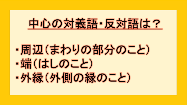ビジネス 中心の対義語・反対語(反対の言葉)・反意語・対照語は?例文も用いて徹底解説! yuki89829403 テクテク(TechTech)ライフ(旧:のほほんライフ) この記事では、「中心」の反対語・対義語について例文も交えて詳しく解説していきます。 反対語・対義語をマスターするには、語彙をどれだけ知 …
