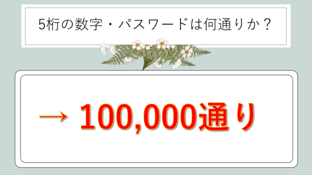 科学 5桁の数字・パスワードは何通りか?【暗証番号:0から9や1から9:組み合わせなど】 freestyle22 テクテク(TechTech)ライフ(旧:のほほんライフ) 日常生活において、銀行のキャッシュカードやスマートフォンのロック解除など、5桁の暗証番号を設定する機会は意外と多いもの。しかし、「実際に何通 …