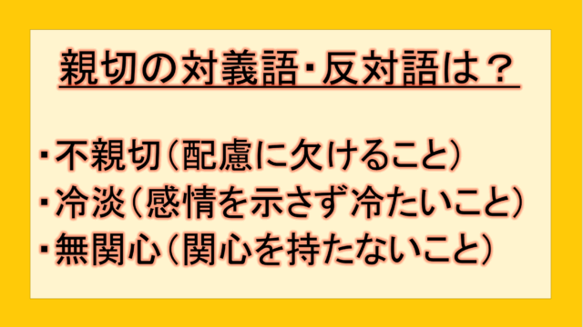 ビジネス 親切の対義語・反対語(反対の言葉)・反意語・対照語は?例文も用いて徹底解説! hilo160 テクテク(TechTech)ライフ(旧:のほほんライフ) この記事では、「親切」の反対語・対義語について例文も交えて詳しく解説していきます。 反対語・対義語をマスターするには、語彙をどれだけ知 …