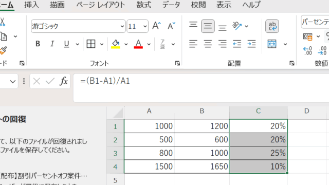 Excel 【Excel】エクセルの値上げ率の計算式や出し方は?何パーセントアップ・増しの計算方法 nohohon-life67 テクテク(TechTech)ライフ(旧:のほほんライフ) Excelで業務を行っていると、価格の変動率を計算する場面は頻繁に訪れます。 商品の値上げ率を算出したい、売上の増加率を把握し …