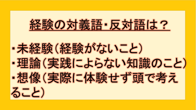 ビジネス 経験の対義語・反対語(反対の言葉)・反意語・対照語は?例文も用いて徹底解説! yuki89829403 テクテク(TechTech)ライフ(旧:のほほんライフ) この記事では、「経験」の反対語・対義語について例文も交えて詳しく解説していきます。 反対語・対義語をマスターするには、語彙をどれだけ知 …