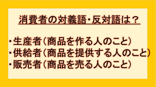 ビジネス 消費者の対義語・反対語(反対の言葉)・反意語・対照語は?例文も用いて徹底解説! yuki89829403 テクテク(TechTech)ライフ(旧:のほほんライフ) この記事では、「消費者」の反対語・対義語について例文も交えて詳しく解説していきます。 反対語・対義語をマスターするには、語彙をどれだけ …