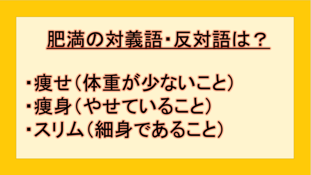 ビジネス 肥満の対義語・反対語(反対の言葉)・反意語・対照語は?例文も用いて徹底解説! yuki89829403 テクテク(TechTech)ライフ(旧:のほほんライフ) この記事では、「肥満」の反対語・対義語について例文も交えて詳しく解説していきます。 反対語・対義語をマスターするには、語彙をどれだけ知 …