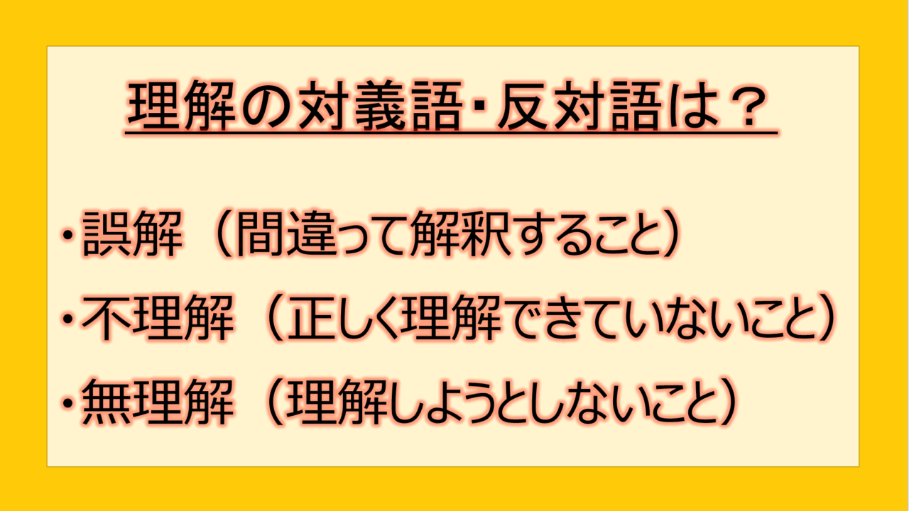 この記事では、「理解」の反対語・対義語を、ビジネスシーンと日常会話の両方で使える例文とともに解説しました。