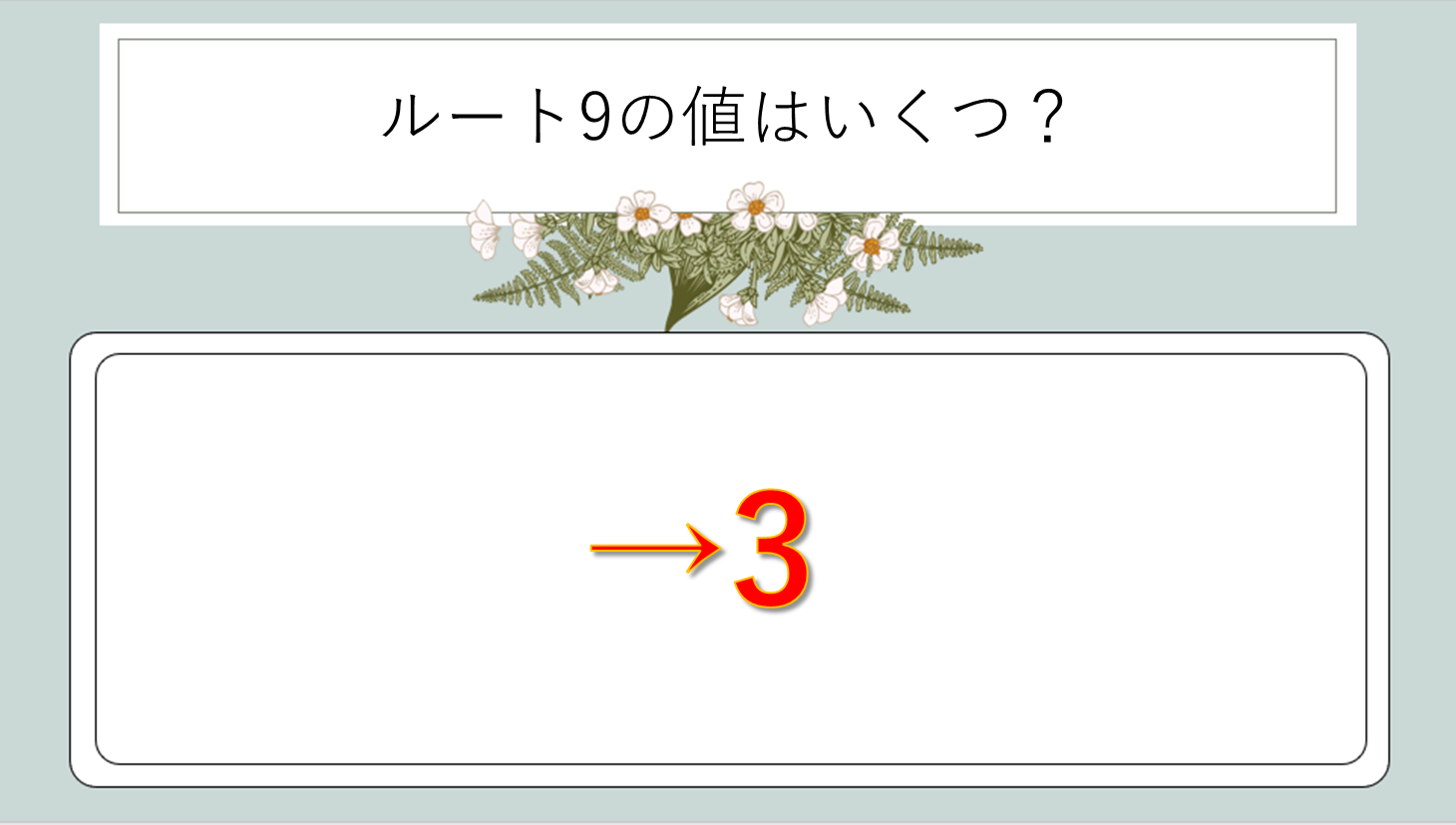 ルート9を覚える最も確実な方法は、「3×3=9」という九九の知識と結びつけること。