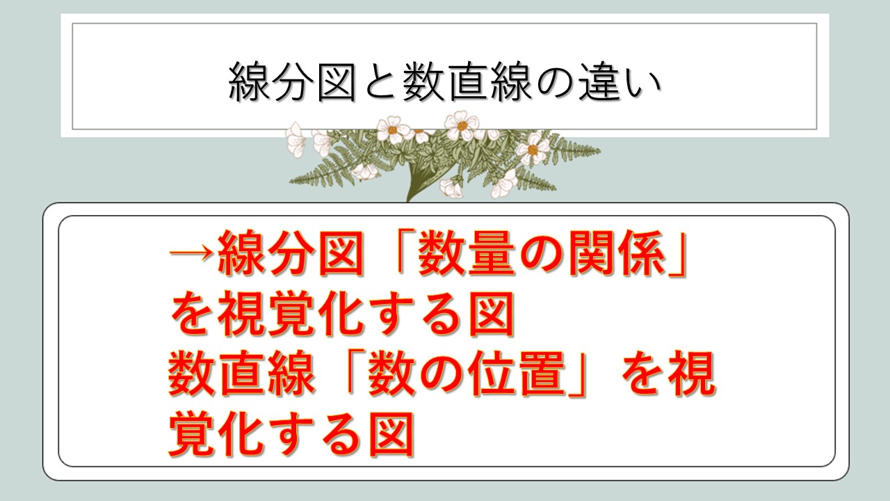さらに、線分図は複数の数量を並べて比較することが多いのに対し、数直線は1本の直線上にすべての数を配置します。この構造の違いも、両者を使い分ける際の重要なポイントになるでしょう。
