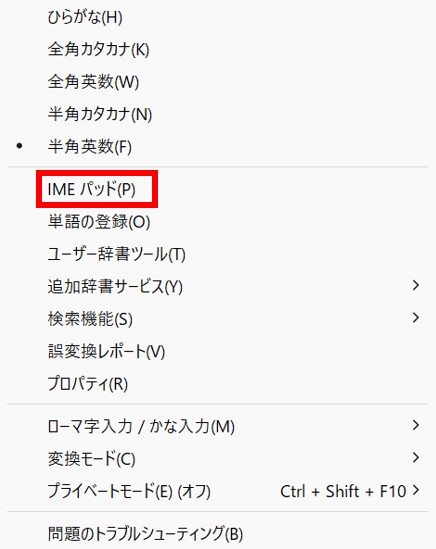 ③ 出てこない場合は「IMEパッド」を開く(タスクバーのIMEアイコンを右クリック→「IMEパッド」)