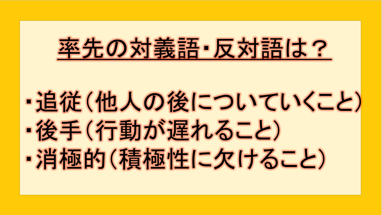 この記事では、「率先」の反対語・対義語について例文も交えて詳しく解説していきます。