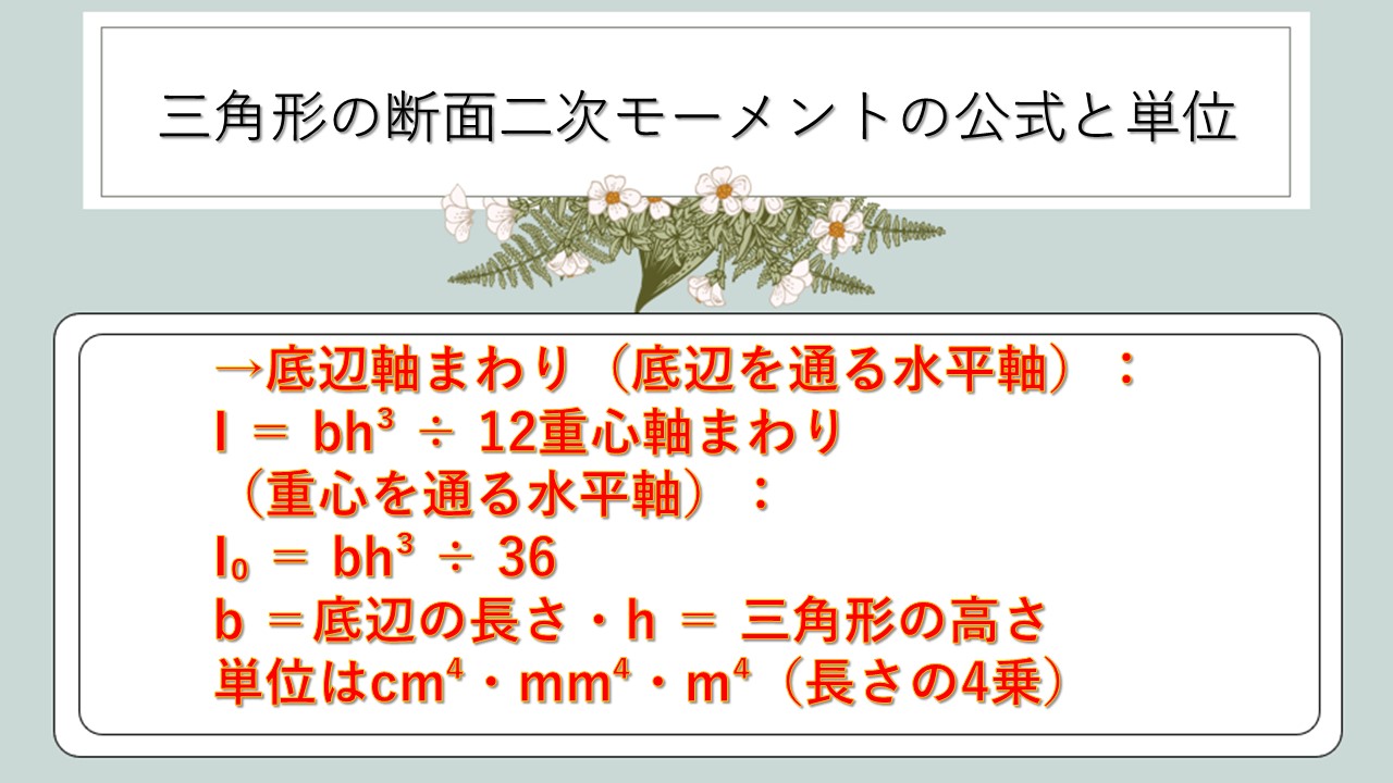 それではまず、三角形の断面二次モーメントの公式と単位について、結論から解説していきます。