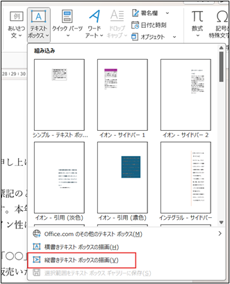 「挿入」タブ→「テキスト」グループから、「テキストボックス」のプルダウンを開き、「縦書きテキストボックスの描画」を選択します。