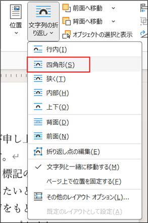 ここで、挿入したテキストボックスの「文字列の折り返し」を設定します。